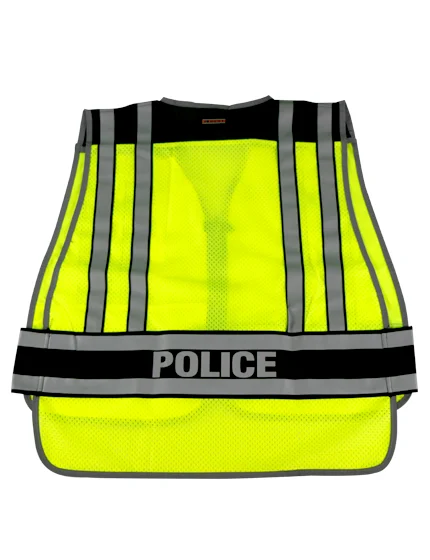 Our all new Lime & Black high-visibility public safety vest has high-viz lime knit and mesh with contrasting black shoulders and velcro waist closure. Pre-labeled with the words POLICE in three locations (two vertical on front and one horizontal on the back) no one will fail to notice the wearer of this vest is a police officer. Adjustable for seasonal attire, rainwear and bullet-proof vests, this vest is available in two adjustable sizes; M to XL and 2XL to 4XL. 4-point break-away design ensures outerwear will tear from the wearer if grabbed or caught on a moving vehicle.